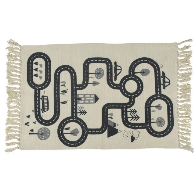 Racen, ontdekken en leren met het Vloerkleed Verkeer! Dit kleurrijke kleed van 80x120 cm is voorzien van een speelse verkeerskaart met wegen, gebouwen en groene landschappen. Perfect om kleine autootjes overheen te laten rijden en spelenderwijs meer te leren over verkeer en navigatie. Gemaakt van zacht en duurzaam materiaal, ideaal voor in de kinderkamer of speelruimte. Laat de fantasie van je kind de vrije loop met dit interactieve en educatieve vloerkleed