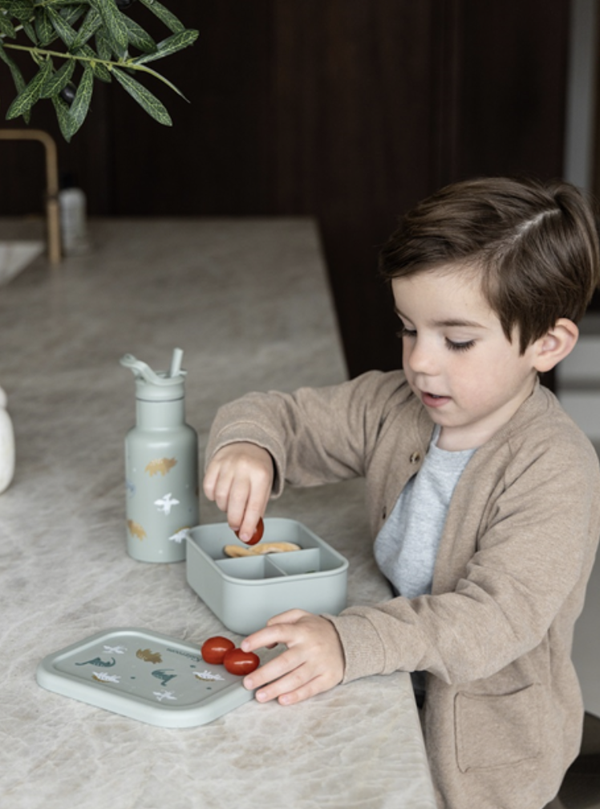 Deze handige lunchbox met drie vakken houdt brood, fruit en snacks netjes gescheiden.