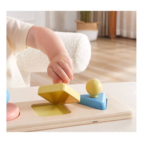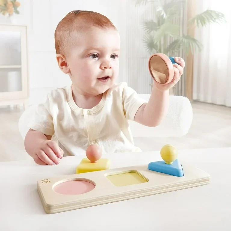 De Hape montessori mirror shape puzzle is de perfecte eerste puzzel voor baby’s vanaf 10 maanden. Deze Montessori vormpuzzel met spiegel laat kinderen spelenderwijs vormen, kleuren én zichzelf ontdekken. Terwijl ze de houten blokjes op de juiste plek leggen, zien ze in de spiegel een vrolijk gezichtje terug; hun eigen!