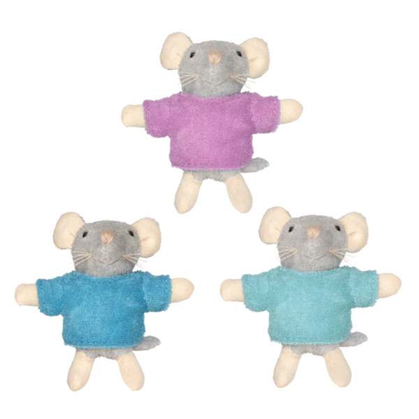 Drie zachte muisjes die niet zonder elkaar kunnen, ideaal om mee te spelen in je eigen muizenhuis of gewoon om samen te knuffelen.