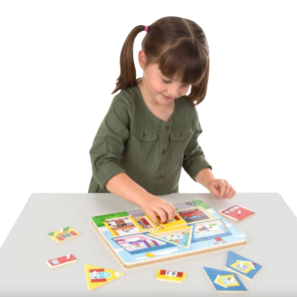 De puzzel is van stevig hout, makkelijk vast te pakken met kleine handjes en super leerzaam. Kinderen oefenen spelenderwijs hun motoriek, luisteren goed en ontdekken al spelend het dagelijkse leven in en rond het huis.
