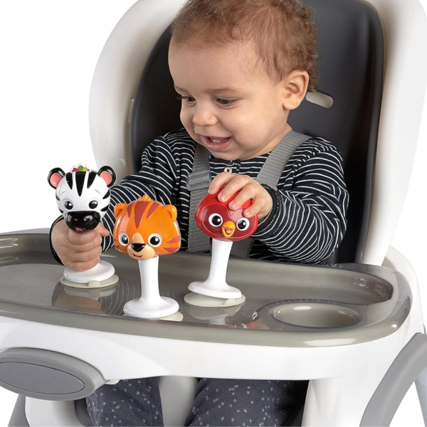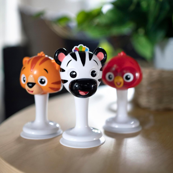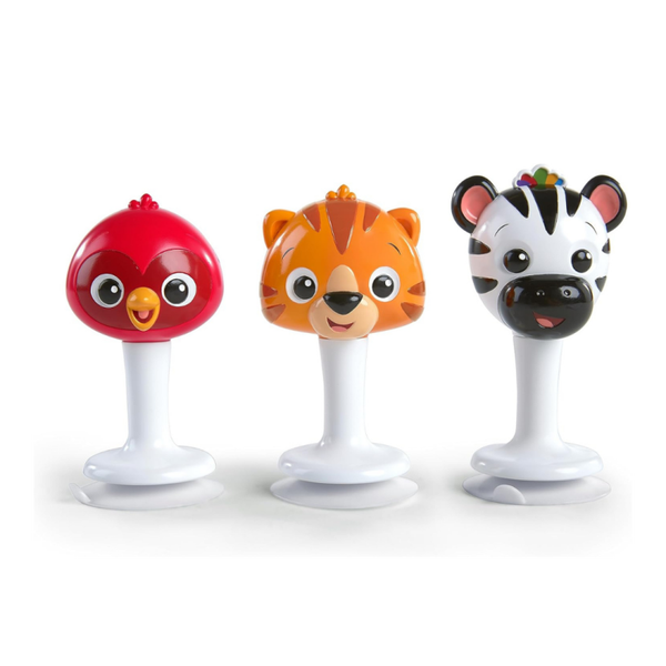 De set bestaat uit drie kleurrijke rammelaars met elk hun eigen geluidje. Dankzij de handige zuignapjes zet je ze zo vast op de kinderstoel, tafel of onderweg.