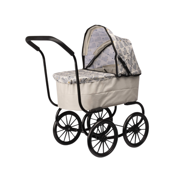 Deze klassieke poppenwagen van Skrållan straalt pure charme uit. De zachte beige stof met grijze hartjesprint geeft hem een tijdloze, lieve uitstraling. Perfect voor heerlijke wandelingen met je favoriete pop.