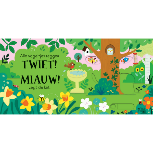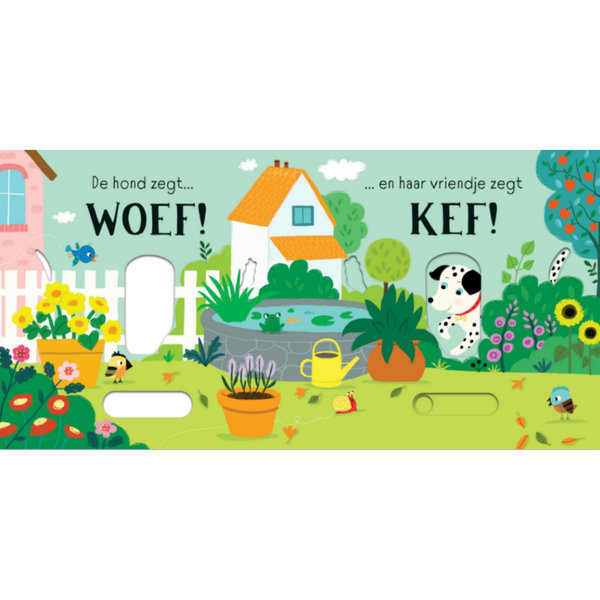 In het geluidenboek “Wat zegt de hond? WOEF!” ontdek je wat honden en katten allemaal te vertellen hebben. Duw de schuifjes naar links en rechts en hoor de dieren écht tot leven komen, elk schuifje laat een ander geluid horen!